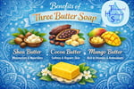 Our Three Butter soap contains Shea butter, Mango butter and Cocoa butter which helps to treat eczema, reduces the degeneration of skin cells, and helps to prevent damage from ultraviolet radiation. It contains vitamins A and E along with fragrant Lemongrass essential oil which acts as a tonic for the body as well as relieves stress related symptoms.